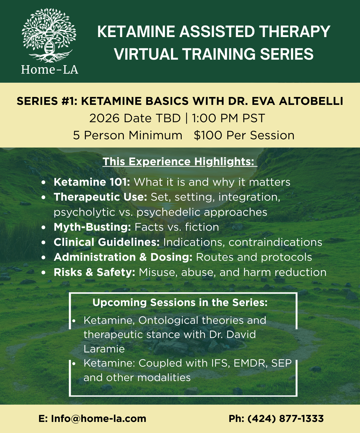 - Psychedelic-Assisted Therapy Training, Portland 2023, and Psychedelic-Assisted Therapy Training, Santa Monica 2024 : 5 day retreat style trainings. —A clinically driven educational experience that honors both the scientific research as well as the humanistic approaches that exemplify the best guidelines in safety, ethics and efficacy. Our retreats offers didactic and experiential learning opportunities, offering a unique cohort model.